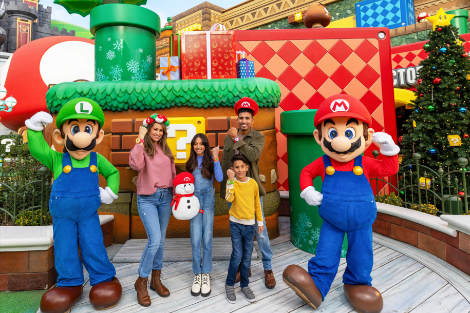 Before stepping into the Mushroom Kingdom at SUPER NINTENDO WORLD, guests will encounter two cheerful snowmen, one sporting Mario’s signature red hat and scarf, the other donning Luigi’s green cap and scarf, alongside a sparkling tree crowned with a Super Star. Guests can also explore a selection of special holiday merchandise available at retail locations throughout the theme park, including the 1-UP Factory™ shop within the land.