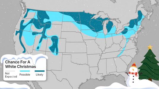 Per weather.com and The Weather Channel app data, a “white Christmas” remains most likely in two key regions: