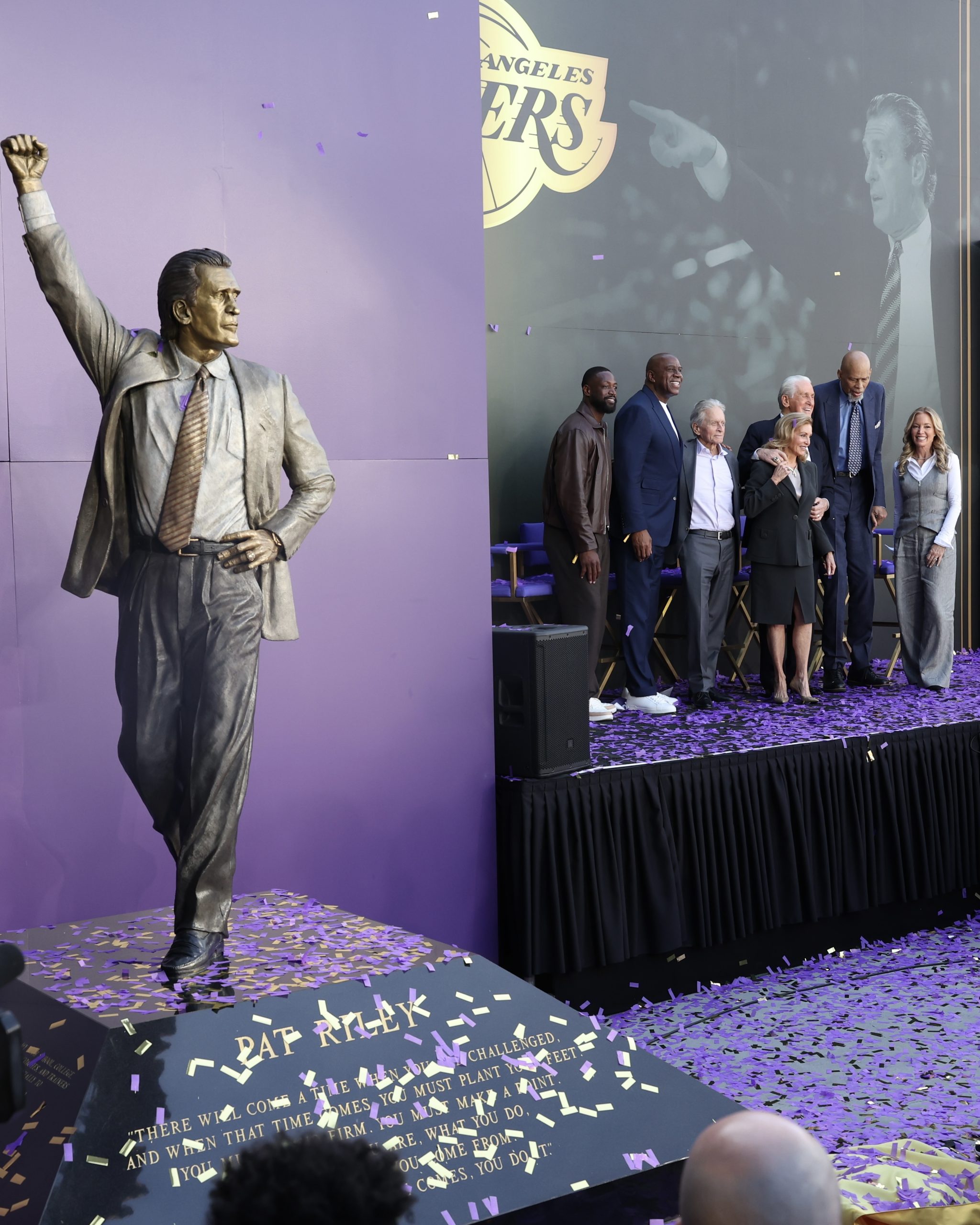Guests gathered in downtown Los Angeles to witness the unveiling and celebrate the coach’s legacy ahead of the Lakers home game versus the Boston Celtics. The ceremony was hosted by Kevin Frazier and featured remarks from Riley, Los Angeles Lakers Governor Jeanie Buss, Kareem Abdul-Jabbar, Earvin “Magic” Johnson, Shaquille O’Neal, Dwyane Wade and Michael Douglas.